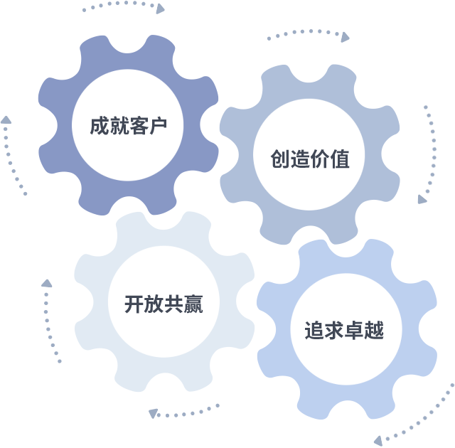成就客户是一切决策的出发点,,,,创造价值是衡量所有工作的标准,,,,追求卓越是我们做事做人的态度,,,,开放共赢是我们的格局也是最终的结果。。。价值观的齿轮环环相扣,,,推动着组织里的每个人不断向前。。。